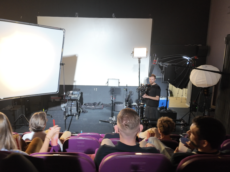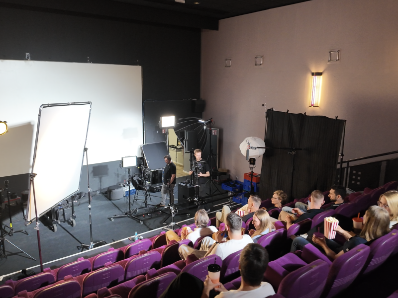 Eine besondere Herausforderung stellte die Inszenierung der Kinoleinwand dar. Für den Clip musste sie filmisch „simuliert“ werden, was dank moderner LED-Leuchten aber problemlos möglich war. Durch präzise Lichtsetzung, gezielte Kameraperspektiven und eine klare, reduzierte Bildsprache entstand ein moderner Event-Teaser mit echter Kino-Atmosphäre.