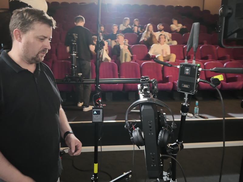An einem kompakten Drehtag fand die Filmproduktion in Bielefeld statt – und zwar ganz bewusst in einem Kinosaal. Diese Location war nicht zufällig gewählt, da auch das Event selbst in einem Kino stattfand. Diese inhaltliche und visuelle Klammer haben wir gezielt genutzt, um bereits im Teaser die besondere Atmosphäre der Veranstaltung vorwegzunehmen. Mit einem eingespielten, dreiköpfigen Team wurde der Kinosaal professionell ausgeleuchtet und dramaturgisch inszeniert, sodass ein cineastischer Look entstand, der sich klar von klassischen Eventtrailern abhebt.